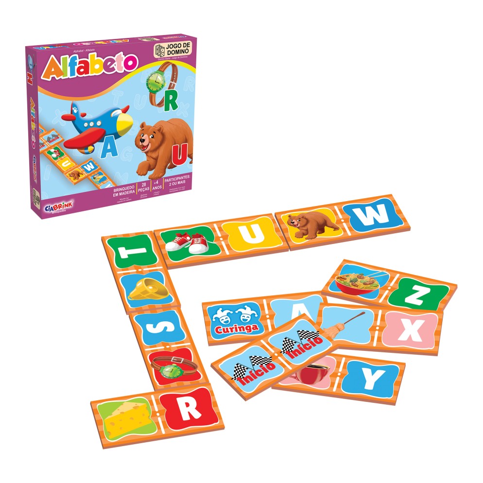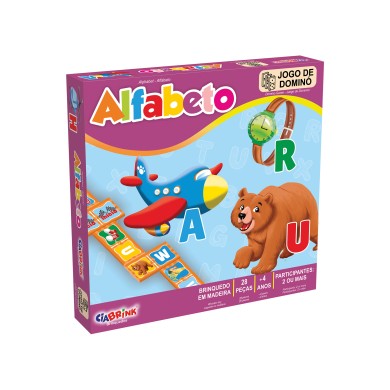 On Domino Alphabet, the pieces are divided between letters and drawings. The objective is to connect a letter piece to a drawing piece that has the same inicial letter in the name.
