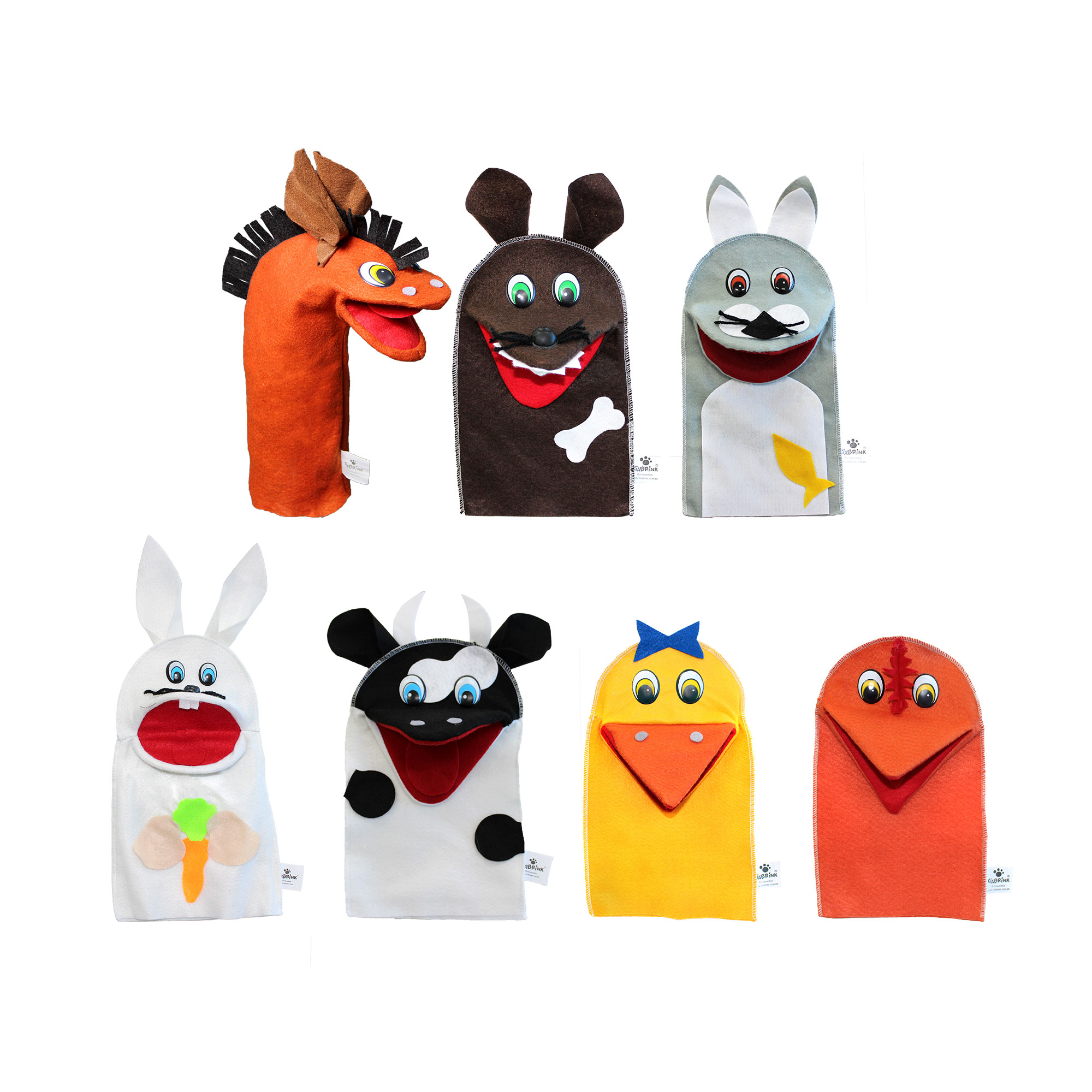 Contém 7 fantoches: Cavalo, Vaca, Pato, Gato, Galo, Coelho e Cachorro.