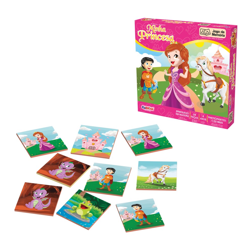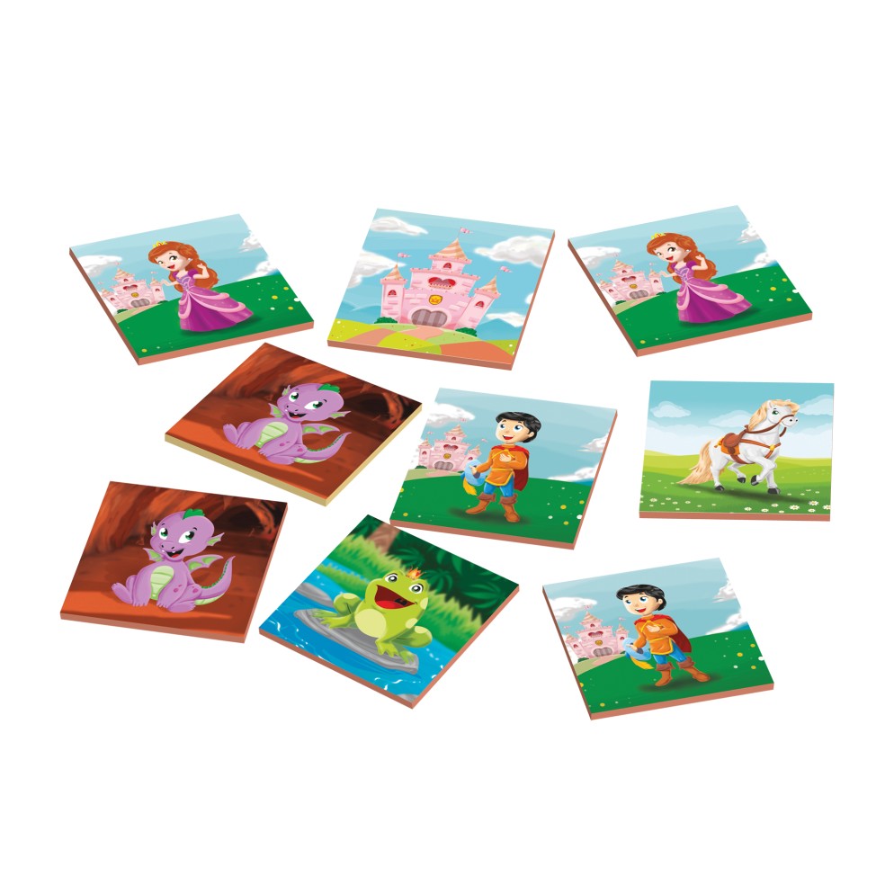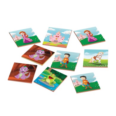 A princess story needs several characters and elements: a castle, a prince, a dragon and a fairy godmother are essential for it. Find the pairs of each of the pieces and create a beautiful story.