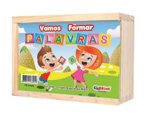 Com peças em madeira coloridas, o brinquedo incentiva a criança a combinar letras e formar palavras, desenvolvendo atenção, criatividade e habilidades cognitivas iniciais.